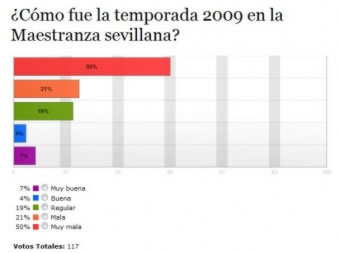 La pregunta del sondeo es muy clara: "¿Cómo fue la temporada 2009 en la Maestranza sevillana?". Existen 5 posibles respuestas: Muy mala, mala, regular, buena o muy buena. El 90% de los encuestados (un porcentaje elevadísimo y realmente abrumador) no duda en mostrar su descontento al calificar la temporada en la Maestranza como "muy mala", "mala" o, a lo sumo, "regular", lo que significa que tampoco está satisfecho con el desarrollo de lo sucedido.