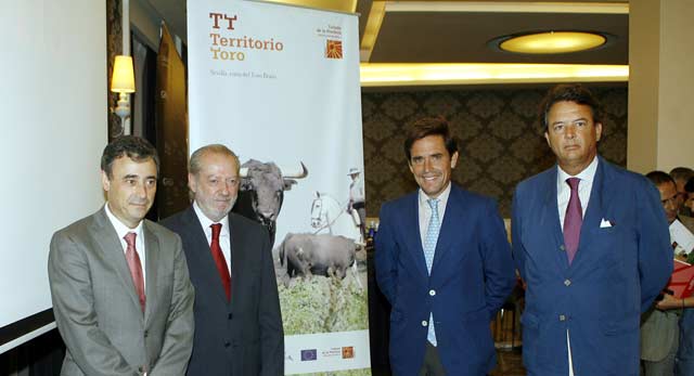 El presidente de la Diputación de Sevilla, Fernando Rodríguez Villalobos, ha presentado en Sevilla el producto turístico ‘Territorio Toro’, una interesante iniciativa promovida por la Diputación hispalense que tiene al toro bravo como eje fundamental. Rodríguez Villalobos estuvo acompañado en este acto por el delegado provincial de Turismo, Francisco Obregón, y el diestro Eduardo Dávila Miura.