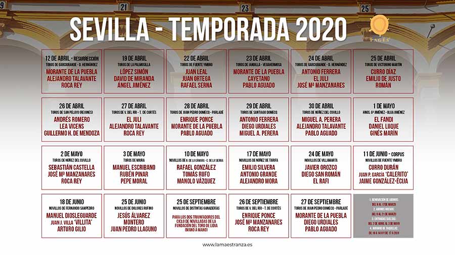 La empresa Pagés ha presentado los carteles del abono de la temporada sevillana 2020. Se repite la misma estructura de 23 festejos: quince corridas, una de rejones y siete novilladas con picadores. Los sevillanos Morante de la Puebla y Pablo Aguado estarán presentes cuatro tardes, aunque Aguado no torea el Domingo de Resurrección.