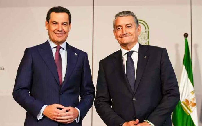 El presidente de la Junta de Andalucía, Juanma Moreno Bonilla, y el consejero de Interior y responsable del nuevo Reglamento Taurino de Andalucía, Antonio Sanz.