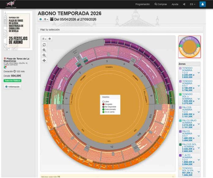 A poco más de 24 horas para que finalice mañana jueves 19 de marzo la venta de abonos para la temporada taurina de la Maestranza, en la web de la venta de abonos de la nueva empresa de la plaza de toros de Sevilla aparece que casi el 100% de las localidades está abonada. Evidentemente, eso no puede ser la realidad, pero el plano de localidades disponibles para la venta de abonos aparece con muy pocos abonos disponibles.