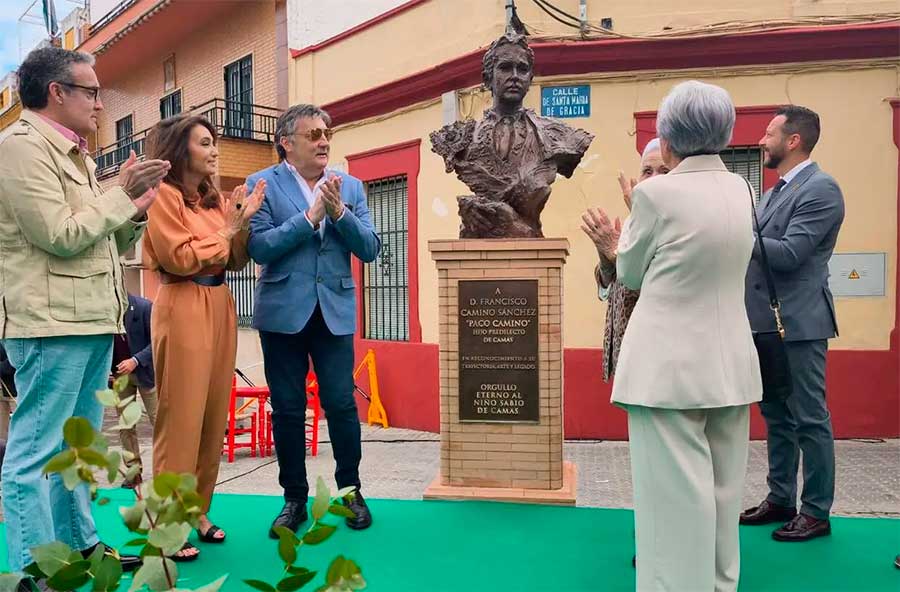 El Ayuntamiento de Camas ha celebrado un acto institucional para rendir homenaje al torero sevillano Paco Camino, Hijo Predilecto y Medalla de Honor del municipio, con el descubrimiento de un busto dedicado a su figura y a su trayectoria. La escultura ha quedado instalada en la calle Santa María de Gracia, en la intersección con la calle que lleva el nombre del propio torero.