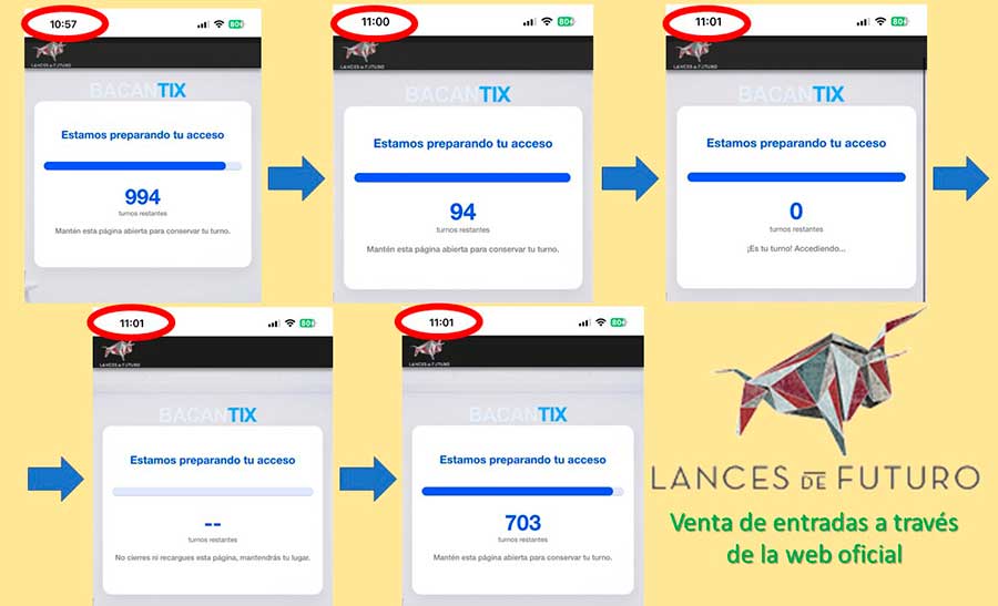 Al entrar en la venta de entradas ‘on line’ de alguna corrida de gran demanda (las de Morante), el sistema dejaba al aficionado ‘en espera’ en una cola virtual que le asignaba un número de cola más allá del 2.000. Sin embargo, en un plazo corto de tiempo mejorando progresivamente el número asignado, cuando llegaba al cero aparecía un mensaje de la empresa que indicaba: «Es tu turno. Accediendo…». Al instante aparecía otro mensaje en el que la empresa indicaba: «Ningún turno restante. Estamos preparando tu acceso. No cierres ni recargues esta página, mantendrás tu lugar».