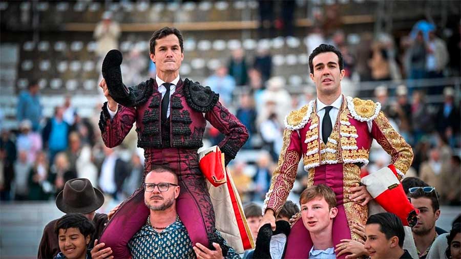 Daniel Luque, a hombros junto a Tomás Rufo en la corrida de hoy Domingo de Pascua en Arles.