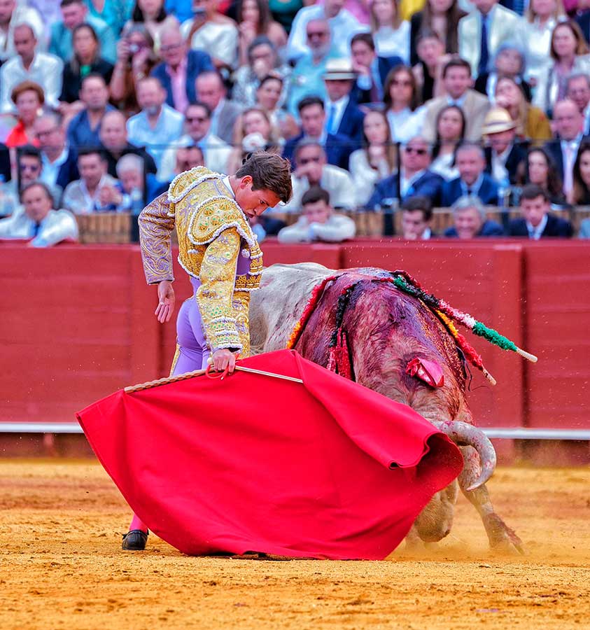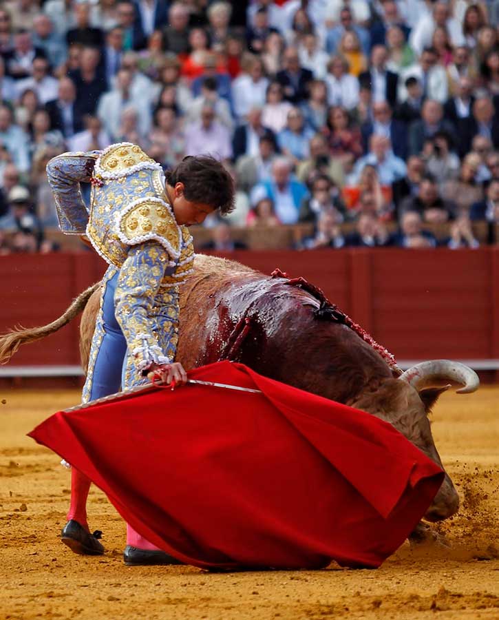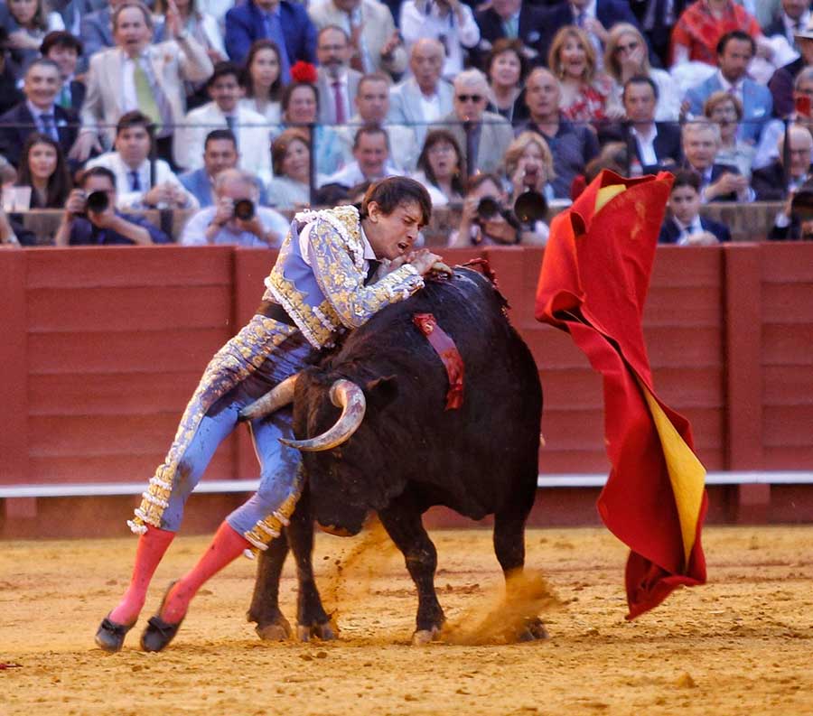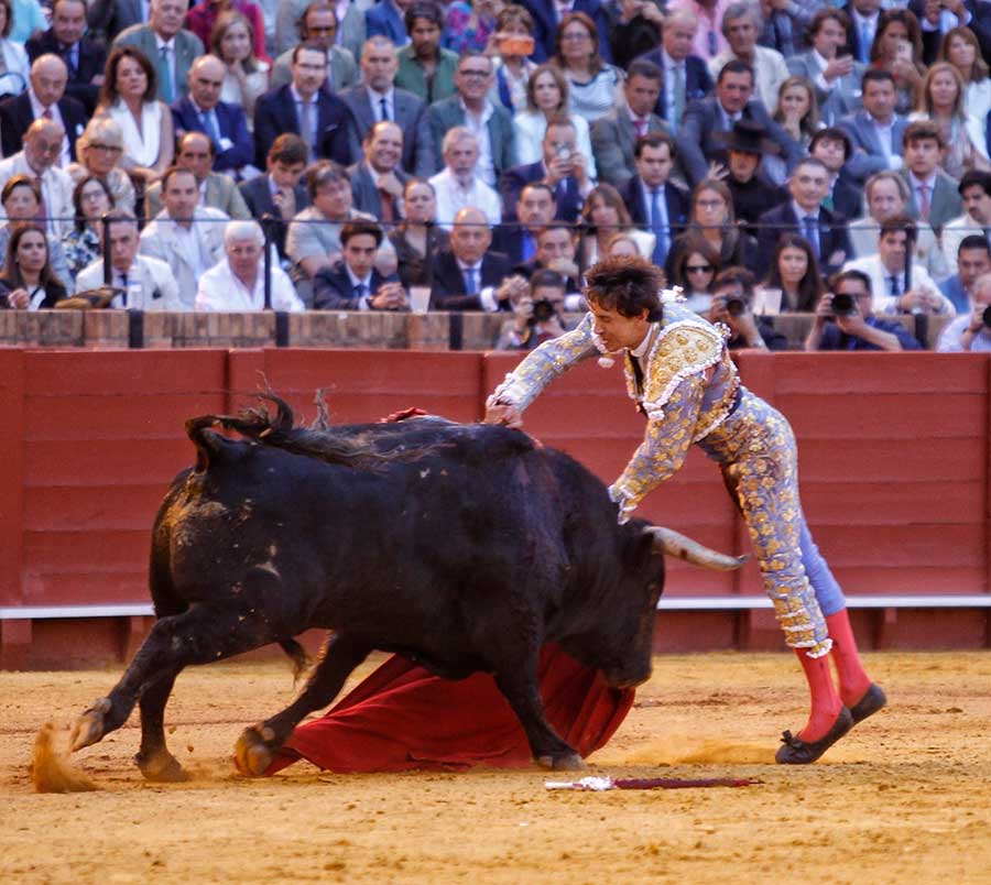 Transcurría la tarde entre silencios. Silencios que no son de desidia. Silencios que son sentencias a la nada ocurrido en el ruedo. Silencios, a veces, majestuosos, espaciosos, definitivos, con los que Sevilla define las anodinas tardes de toros. Hoy, el silencio, se convirtió en el grito desgarrador ante la trágica cogida, convirtiéndose de inmediato en el clamor del triunfo. Todo un vuelco para una tarde que caminaba zigzagueante por los vericuetos de la complicada mansedumbre. Sin embargo, apareció por la puerta de chiqueros el quinto toro, marcado con el hierro de Toros de Cortés, con el que Andrés Roca Rey cumplió su objetivo: cortarles las orejas.