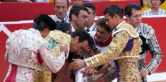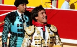 Morante de la Puebla, ganadero e impulsor del novedoso proyecto, a hombros tras la novillada en la que fue ganadero celebrada en su pueblo y acompañado por los cinco noveles locales. (FOTO: Marta Verdugo)