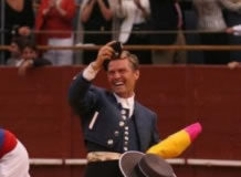 Morante de la Puebla, ganadero e impulsor del novedoso proyecto, a hombros tras la novillada en la que fue ganadero celebrada en su pueblo y acompañado por los cinco noveles locales. (FOTO: Marta Verdugo)