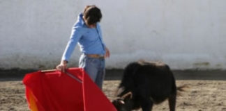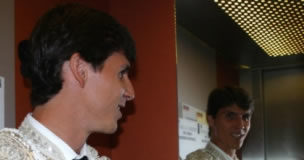 Morante de la Puebla, ganadero e impulsor del novedoso proyecto, a hombros tras la novillada en la que fue ganadero celebrada en su pueblo y acompañado por los cinco noveles locales. (FOTO: Marta Verdugo)
