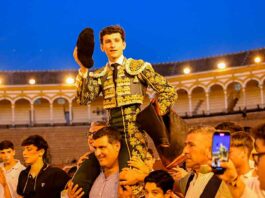 Morante de la Puebla, ganadero e impulsor del novedoso proyecto, a hombros tras la novillada en la que fue ganadero celebrada en su pueblo y acompañado por los cinco noveles locales. (FOTO: Marta Verdugo)