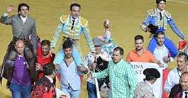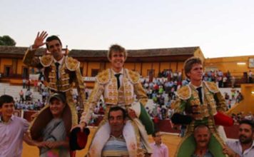 Morante de la Puebla, ganadero e impulsor del novedoso proyecto, a hombros tras la novillada en la que fue ganadero celebrada en su pueblo y acompañado por los cinco noveles locales. (FOTO: Marta Verdugo)