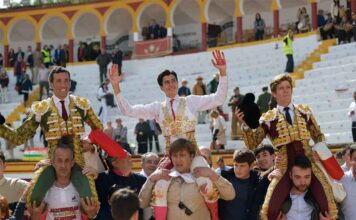 Morante de la Puebla, ganadero e impulsor del novedoso proyecto, a hombros tras la novillada en la que fue ganadero celebrada en su pueblo y acompañado por los cinco noveles locales. (FOTO: Marta Verdugo)