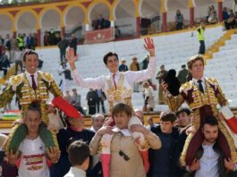 Morante de la Puebla, ganadero e impulsor del novedoso proyecto, a hombros tras la novillada en la que fue ganadero celebrada en su pueblo y acompañado por los cinco noveles locales. (FOTO: Marta Verdugo)