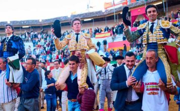 Morante de la Puebla, ganadero e impulsor del novedoso proyecto, a hombros tras la novillada en la que fue ganadero celebrada en su pueblo y acompañado por los cinco noveles locales. (FOTO: Marta Verdugo)