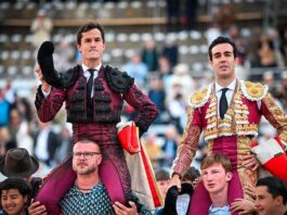 Morante de la Puebla, ganadero e impulsor del novedoso proyecto, a hombros tras la novillada en la que fue ganadero celebrada en su pueblo y acompañado por los cinco noveles locales. (FOTO: Marta Verdugo)