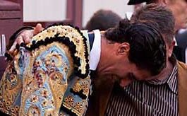 Morante de la Puebla, ganadero e impulsor del novedoso proyecto, a hombros tras la novillada en la que fue ganadero celebrada en su pueblo y acompañado por los cinco noveles locales. (FOTO: Marta Verdugo)